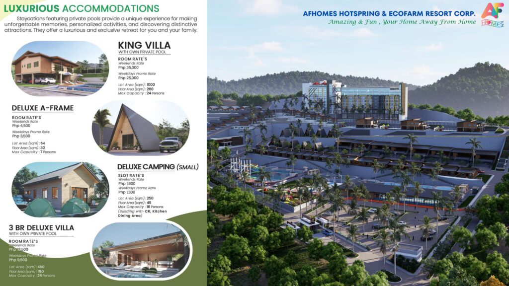 Featuring a total of 60 hectares master planned project, with more than 20 hectares of Natural Hot Springs and Resort, Restaurants, Amenities area, over 600 staycation units with different purposes.